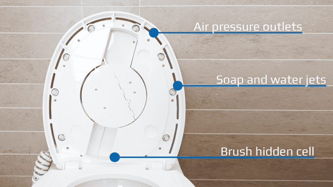 With the water jets sprinkling water, the brush rotates around the bowl and cleans every corner of the surface, even the parts which are not accessible otherwise.