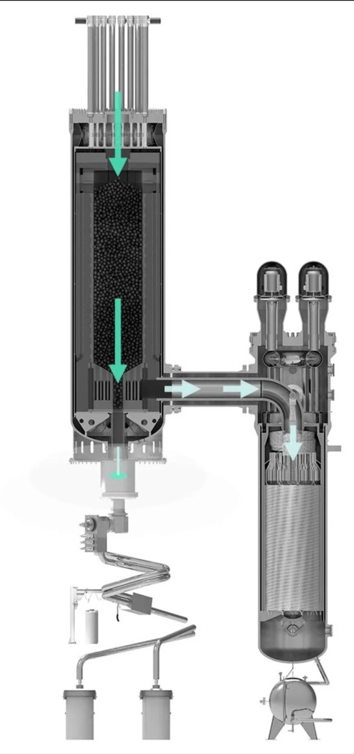 The Xe-100 represents a new class of High-Temperature Gas-cooled Reactors (HTGRs) fueled by TRISO-X particles tiny grains of uranium encased in protective layers of carbon and ceramic, bundled into spherical pebbles. These pebbles are fed through a hopper into the reactor, where they sustain a self-regulating fission reaction cooled by helium gas. The heat produced drives turbines to generate electricity, while used fuel is collected efficiently at the bottom of the vessel.