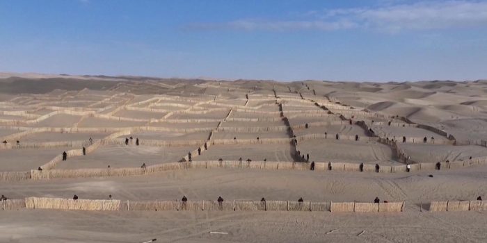 China has completed a 153-kilometer green barrier belt to stop the Tengger Desert, its fourth-largest desert, from expanding eastward, marking a significant milestone in the fight against desertification worldwide. The last row of straw chequerboards, an ancient but very successful sand-fixing technique, was put in place in Changliushui village, Zhongwei City, to secure the shifting dunes in the Ningxia region of the desert.