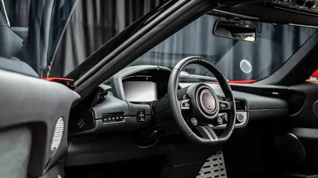 Inside, the car continues its minimalist philosophy. The cabin features a driver-focused display, physical climate controls, and a traditional handbrake. There is no attempt to replicate the large touchscreens or semi-autonomous driving systems common in modern EVs. The design is intentionally old-school, with inspiration reportedly drawn from classic sports cars like the Lancia Stratos.