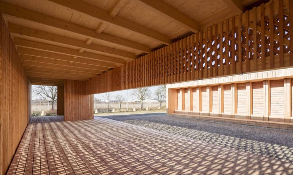 The community center is constructed entirely out of lightweight untreated timber, with the larger pieces prefabricated in a former military facility and later, assembled.