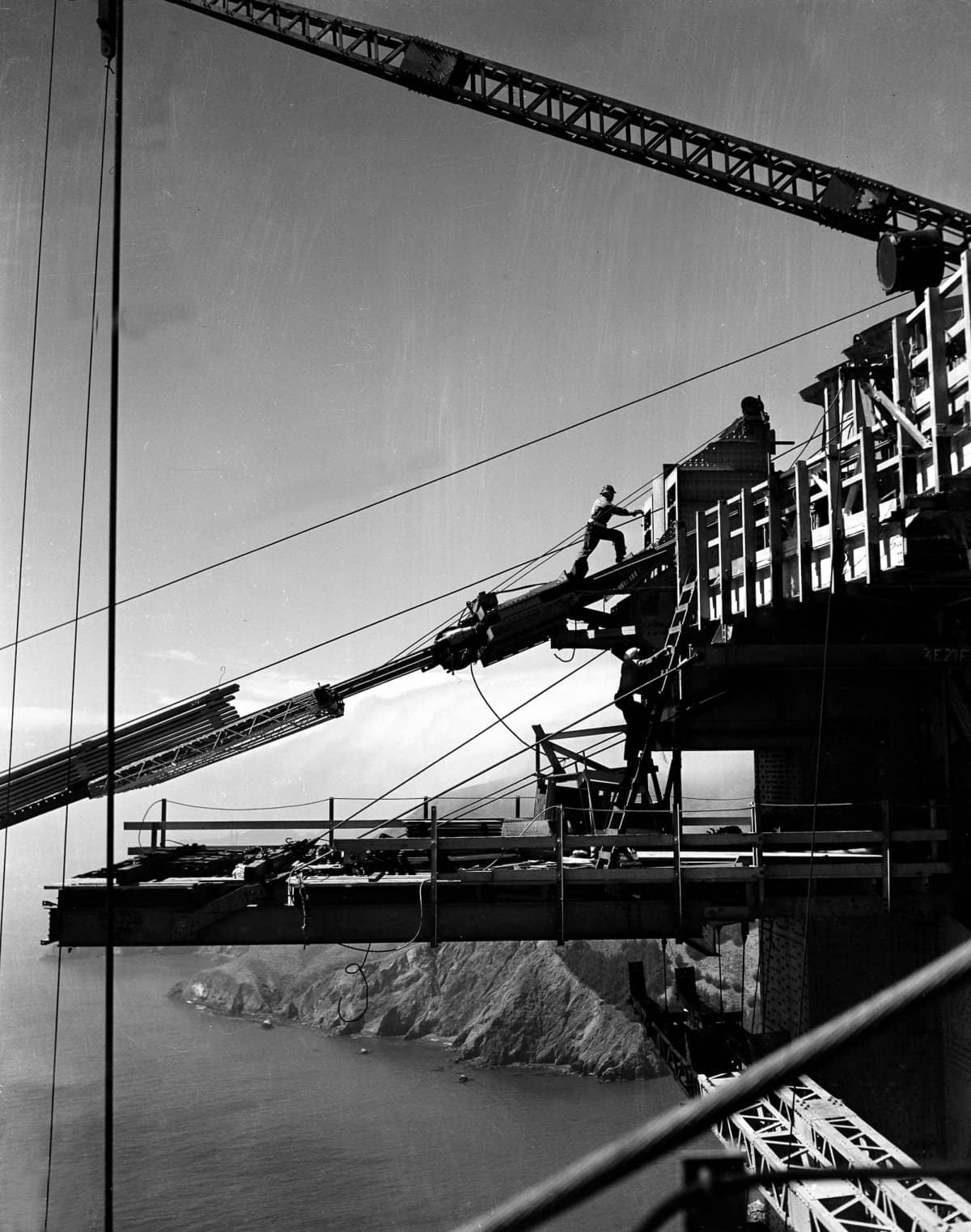 The construction began in 1933 at the hands of President Franklin Roosevelt who pressed a button, setting off a charge of dynamite on July 9th. 3.25 million cubic feet of dirt was dug out to place 12 story tall towers. The workers had to dive to depths of 90 feet, blasting away the rock and removing the debris. Built with 1.2 million rivets, 80,000 miles of spliced wire, and 254 steel suspender ropes, the bridge spread over 4,200 feet, becoming the longest suspension bridge of the time.