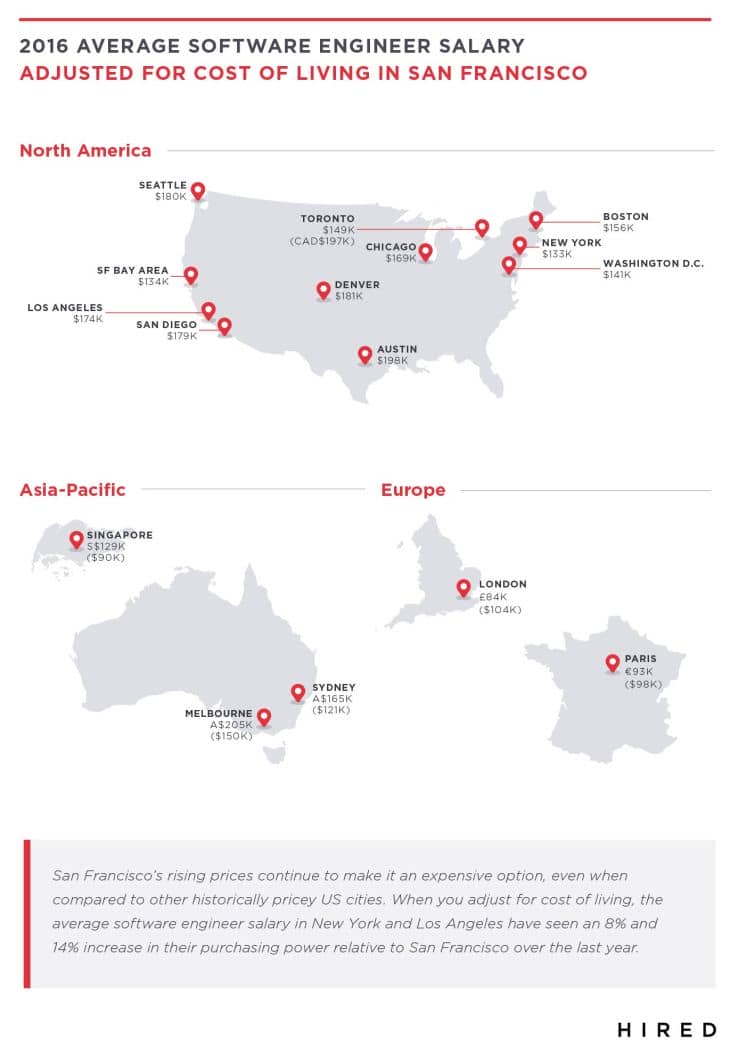 The skyrocketing living expenses in Silicon Valley, according to Hired’s lead data scientist Jessica Kirkpatrick make San Fransisco one of the lowest-paying places for software engineers. The analysis suggests that when the cost of living is factored in, making $198,000 in the Bay Area is equivalent to $110,000 that a software engineer in Austin makes. In Melbourne, Australia a software engineer roughly makes seemingly low $107,000 on average, but this is an equivalent of $150,000 in San Fransisco.
