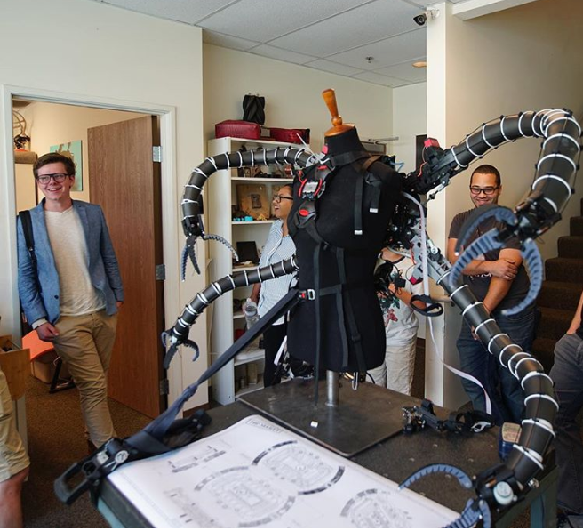 “One of the things is we wanted to be able to bend and have the arm have all these degrees of rotation and these bending points. So, we could’ve had 50 expensive, super-heavy motors, but that wouldn’t have worked out. So, what we did is we got all these coffee cups and we got these three very slim carbon fiber wires so that you can pull the cups to go in a certain way. And in the back, there is one motor for each arm, so four motors to control the position of the strings so that way it pulls it a certain way. So, it’s actually really clever how we were able to do that super cheap and super lightweight because that was one of the biggest problems.”
