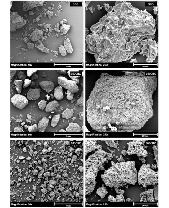 Scanning electron microscope images from the study show the porous microstructure of these coffee-derived biochar particles, which help interlock with the cement matrix and improve overall strength.