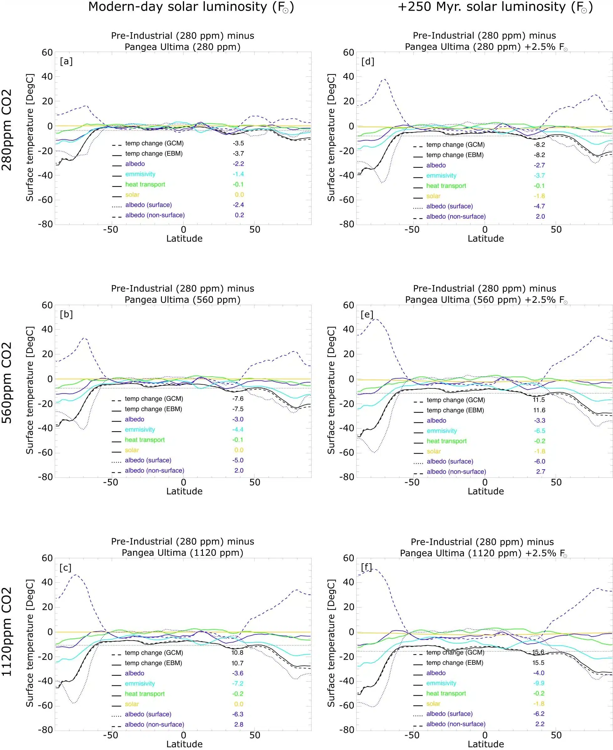 Energy balance model analysis for each experiment relative to the 280 ppm Pangea Ultima experiment. Credit: Nature Geoscience