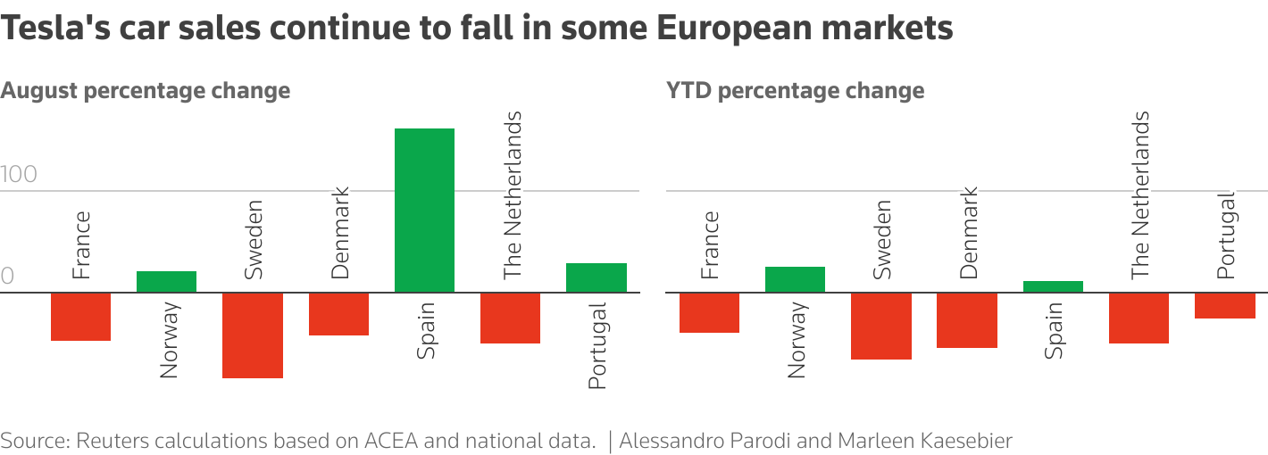 There were some bright spots. In Norway, one of Tesla’s most established markets where nearly all car sales are electric, registrations climbed 21.3%. Yet even there, BYD outpaced Tesla with an eye-catching 218% surge. Spain and Portugal also offered rare relief: Tesla sales in Spain soared 161%, supported by generous EV subsidies, while Portugal saw a 28.7% increase after seven months of declines. Still, BYD once again outperformed, selling more cars than Tesla in Spain and notching a 675% year-to-date increase, compared with Tesla’s modest 11.6% rise.
