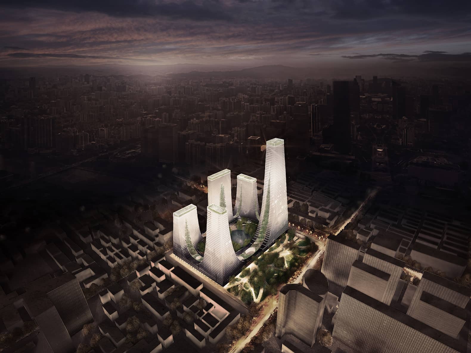The towers will host all sorts of buildings, from offices and apartments to hotels. The base will feature retail and leisure outlets open to the public. Each building will have a landscaped rooftop. Besides the eye-catching structure, its fritted glass outlook has a responsive skin that helps to minimize solar heat gain.