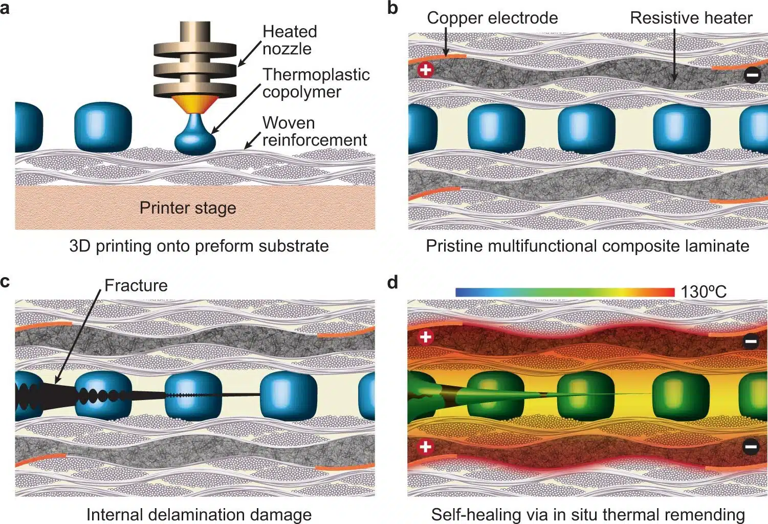 To solve this researchers introduced a 3D printed interlayer made from a thermoplastic polymer called EMAA This layer is embedded between composite sheets and acts as a built in repair system In addition to enabling healing the interlayer also improves resistance to damage making the material two to four times more resistant to delamination from the outset