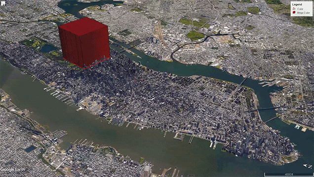 Surprisingly, the answer comes out with a building not that big at all. In fact, the red cube in the picture above would do the trick and would take just a few blocks of Manhattan.