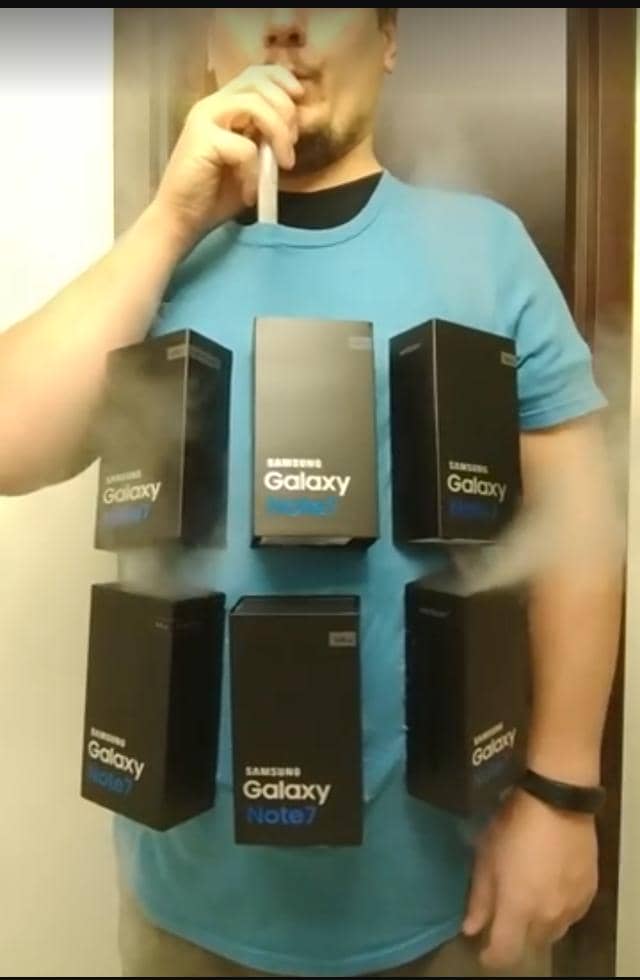 Kiley uses a tube system under his shirt to blows smoke through the six Note 7 boxes strapped to his chest. The boxes obviously would be easily available after the nationwide recalls, although he would be well advised not to visit any airports this Halloween.