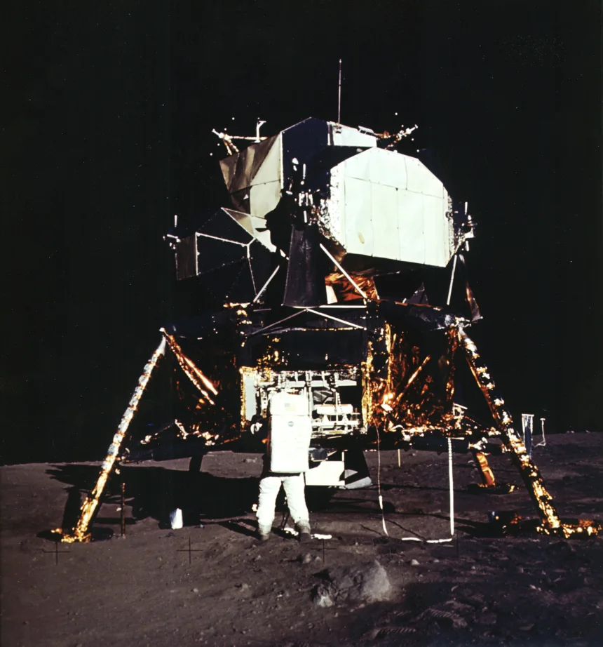 Buzz Aldrin stands next to the lunar module on the surface of the moon during Apollo 11.